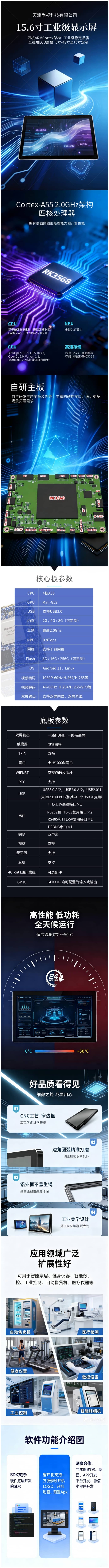 HR3568-H15602是以安卓(Android)为操作系统的,带有 15.6吋1920x1080彩色液晶屏,电容触摸屏的显示模组,拥有高性能Rk3568主处理器,2G内存(可定制);16/32GFlash (可定制) ,支持USB3.0接口,支持Wifi,蓝牙等扩展接口,支持双屏同显、支持双屏异显。